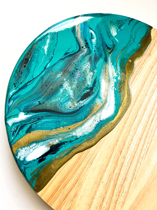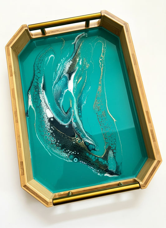 Geode Inspired Bamboo Tray- Teal waves