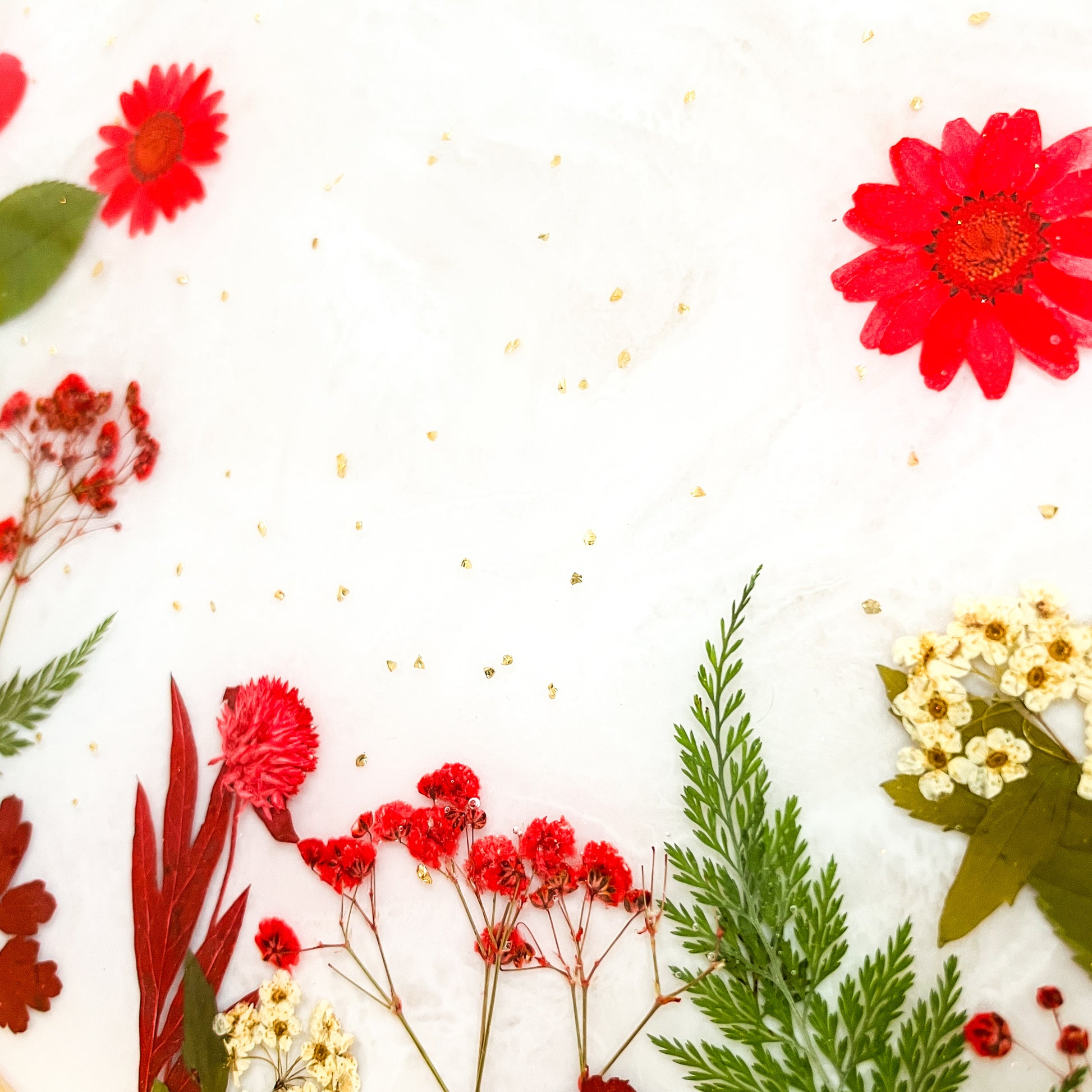 This botanical resin tray is thoughtfully handcrafted to capture the beauty of nature in a refined, minimalist design. Real florals are carefully arranged and preserved beneath multiple layers of high-quality resin, creating depth, clarity, and long-lasting beauty.