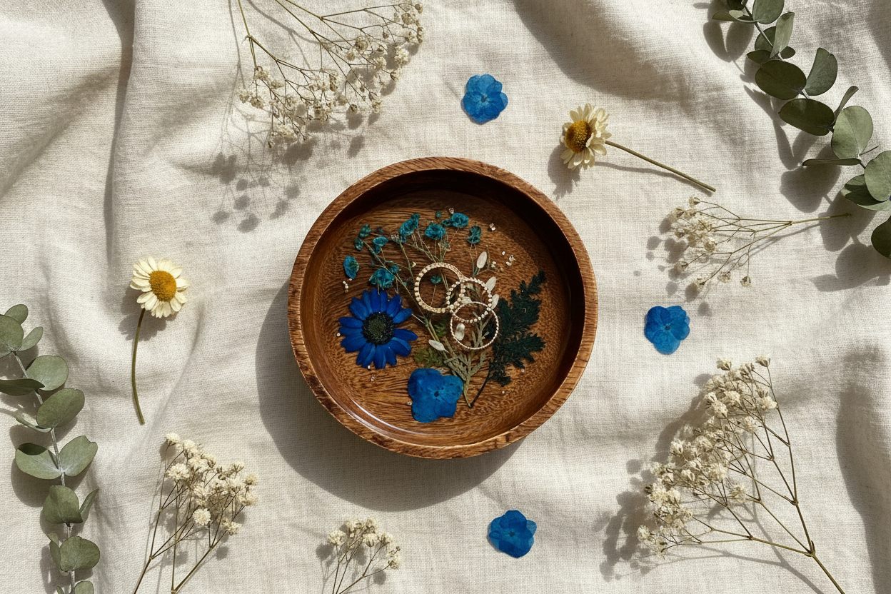 Crafted from warm, rich natural wood, this dish is perfect for holding your rings, earrings, keys, crystals, or small keepsakes. Its botanical charm adds a soft, artistic touch to any bedside table, vanity, or entryway. Each dish is one-of-a-kind, preserving the natural character of the flowers and wood grain — no two pieces will ever be the same.
