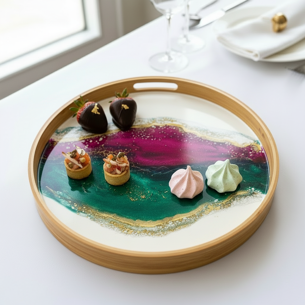 Geode Inspired Bamboo Tray- Peacock Maroon Green