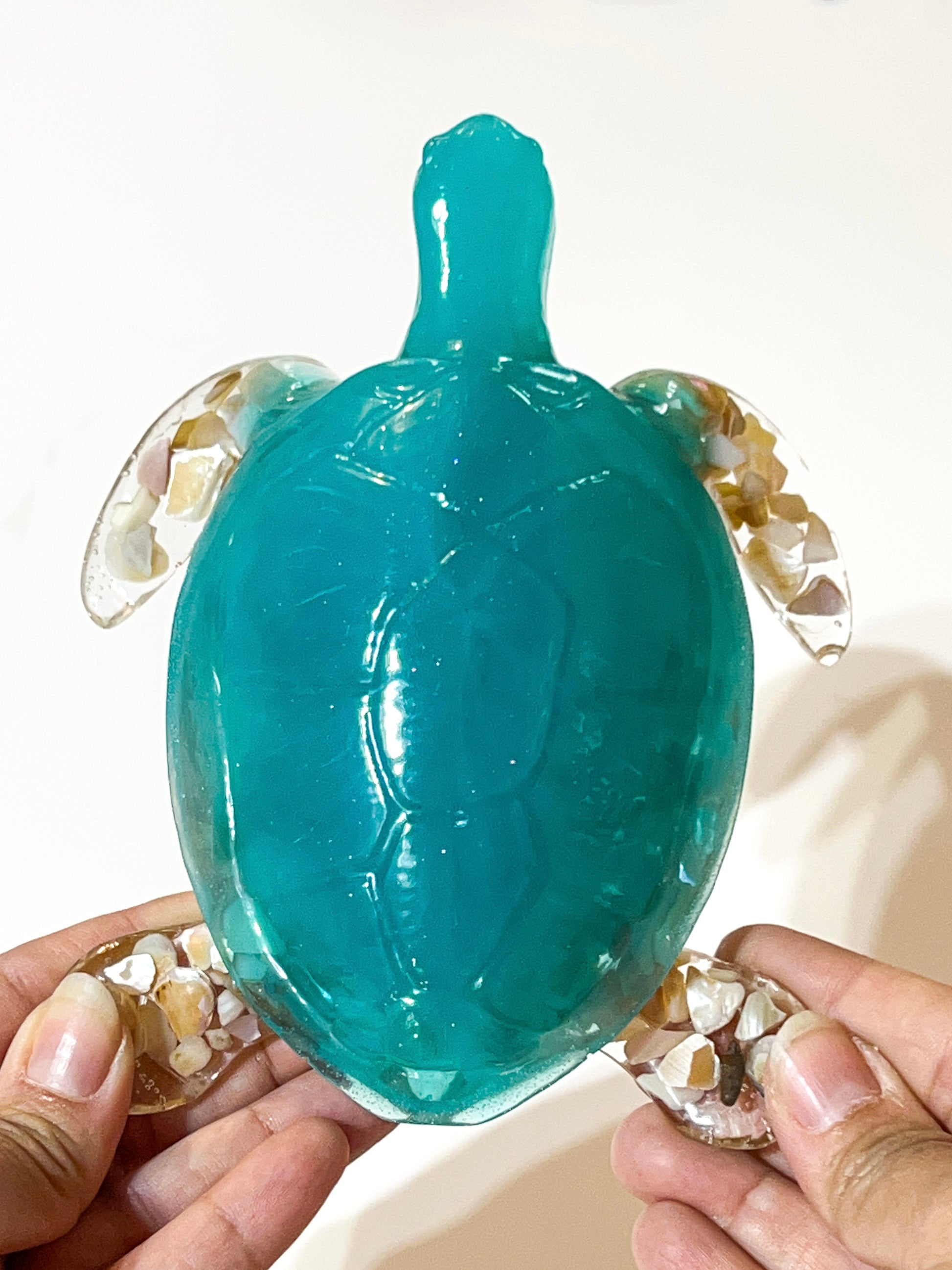 Inspired by the graceful movement of sea turtles, this decorative resin sculpture captures the essence of the ocean through carefully layered pours and organic coastal elements. Each turtle is handcrafted individually, allowing the colors, textures, and embedded details to naturally vary—making every piece truly one of a kind.
